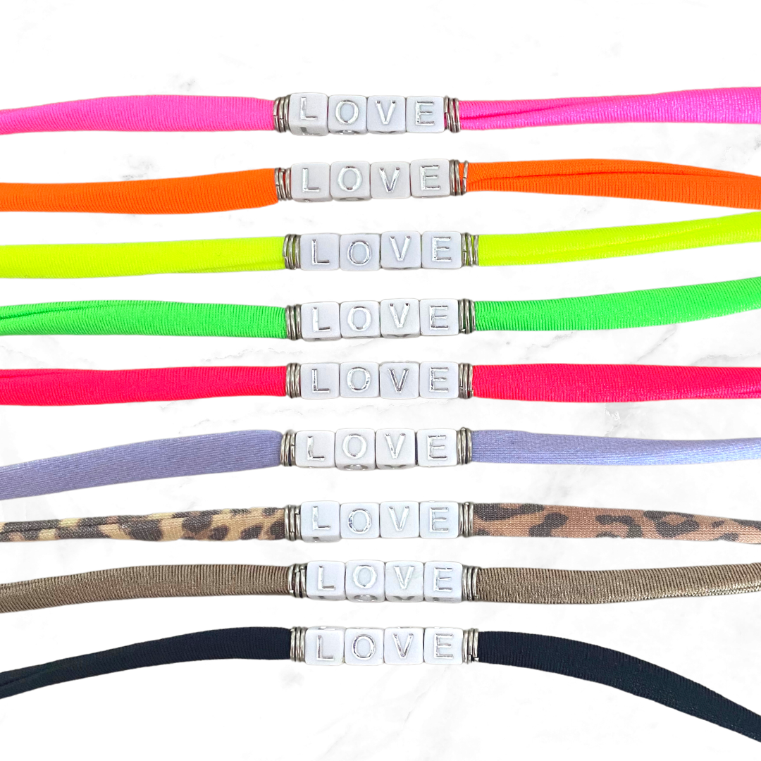 Materiaal: Ibiza-elastiek, Acryl letterkralen, RVS ringetjes.