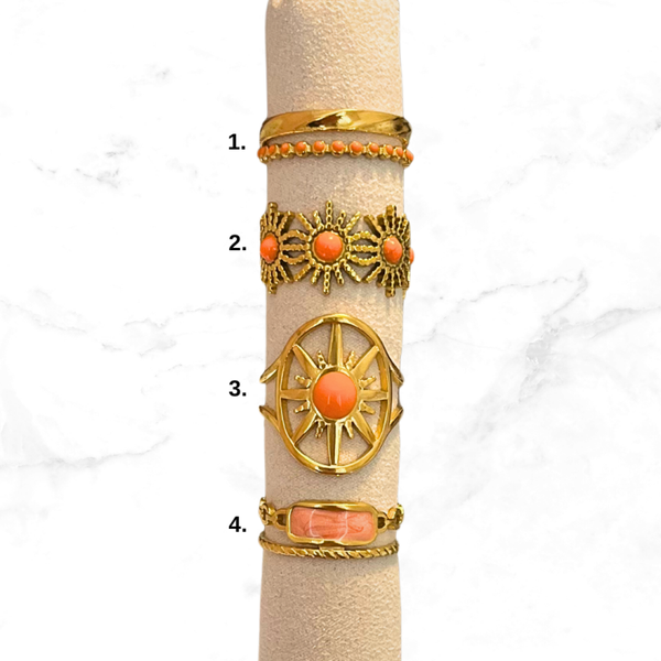 Verschillende goudkleurige RVS ringen met oranje accenten.