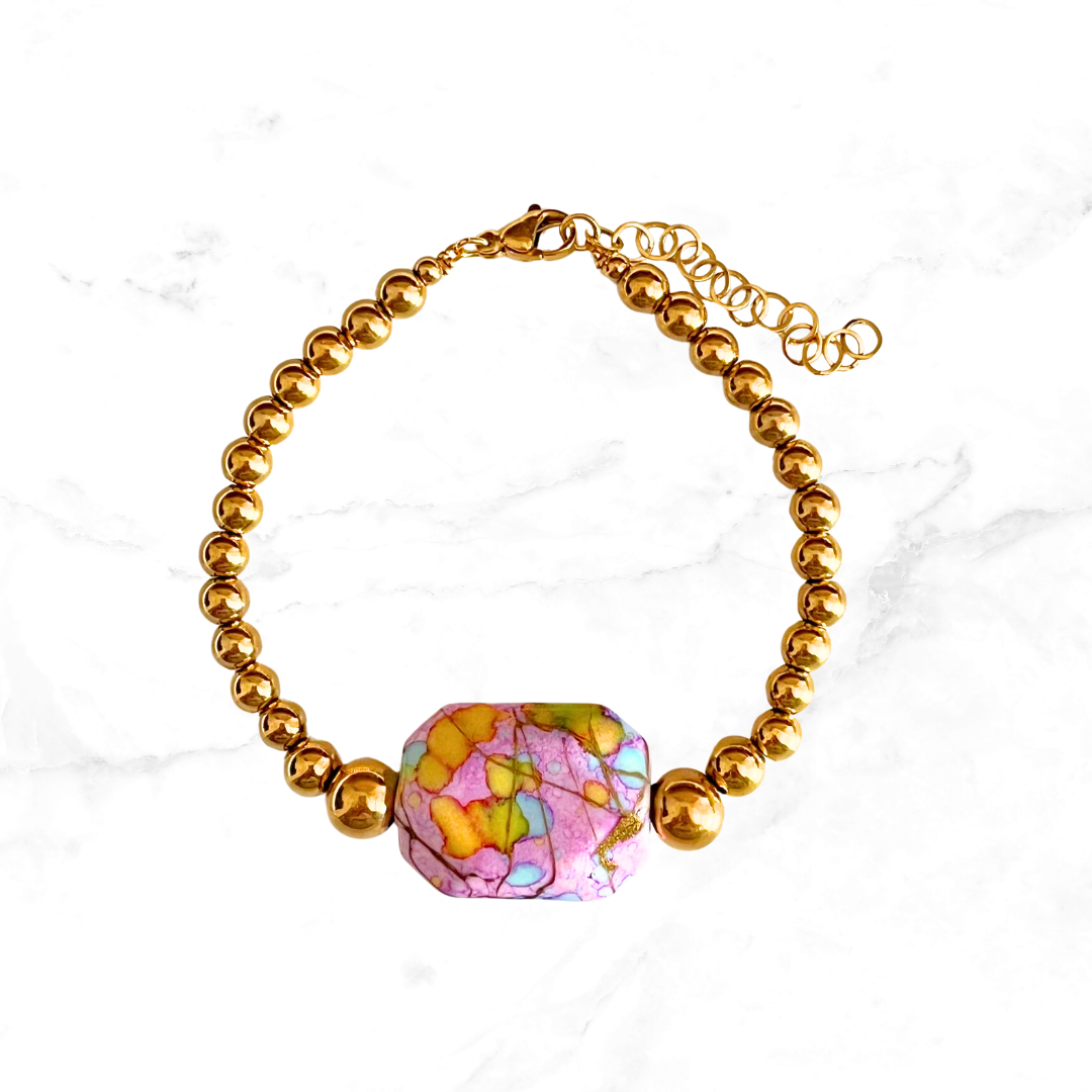 RVS armband met een zeshoekige, paarse, prachtige kraal.