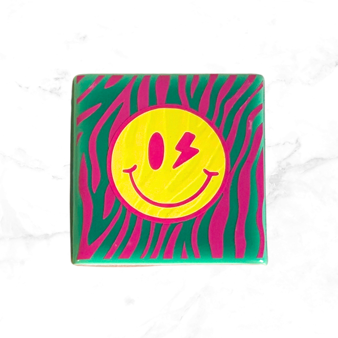 Groene keramische tegel met fuchsia zebraprint en gele/fuchsia smiley.