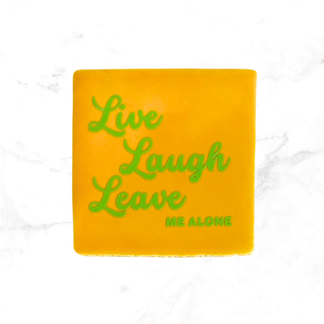 Oranje keramische tegel met groene tekst Live Laugh Leave me alone.