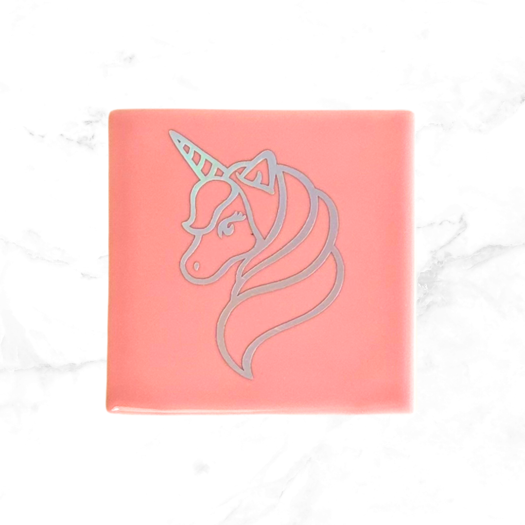 Roze keramische tegel met holografische unicorn.