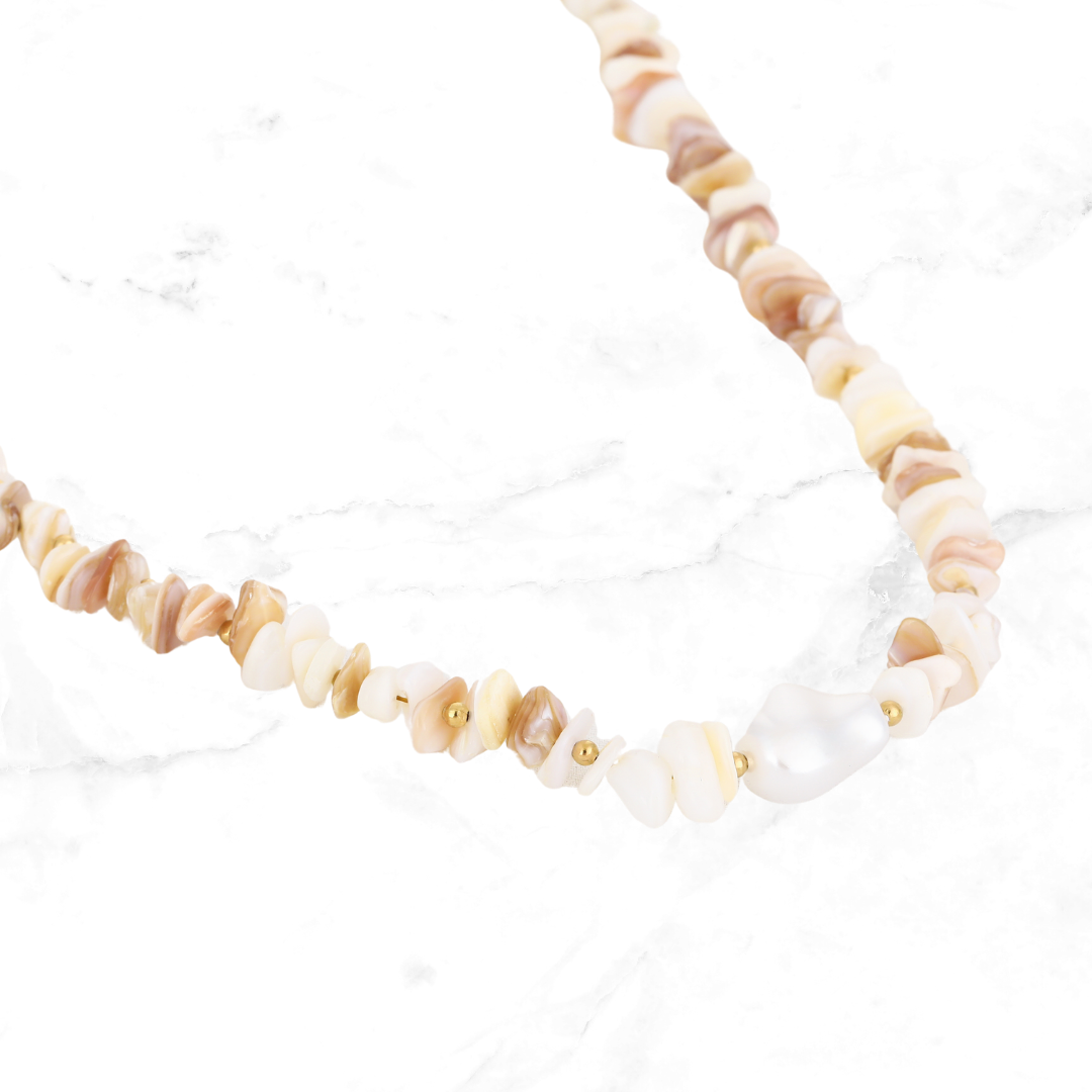 Omdat de schelpkralen verschillend zijn qua vorm, kleur en grootte is elke ketting uniek en kan dus enigzins afwijken van de foto's.