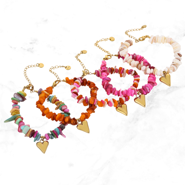 Ibiza armband met mooie, gekleurde schelpkralen en RVS hart.