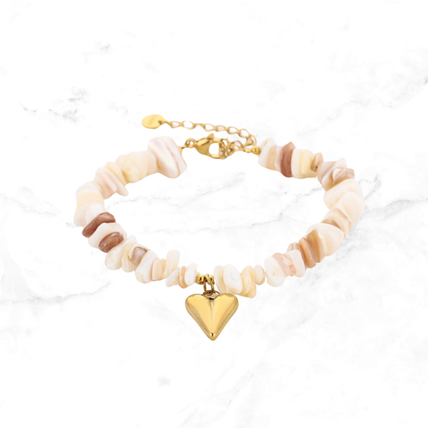 Ibiza armband met mooie, gekleurde schelpkralen en RVS hart.