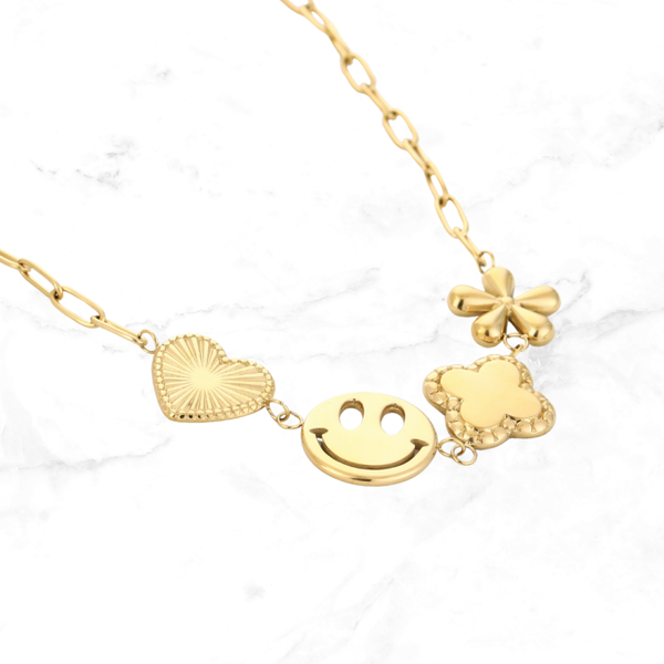 RVS Ketting Hart-Smiley-Klaver-Bloem - Goud